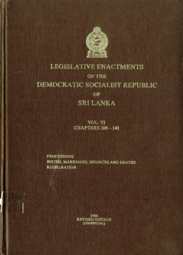 Legislative Enactments of the Democratic Socialist Republic of Sri Lanka. Professions, Births, Marriages, Divorces Deaths Registrations (chapters 109-140)