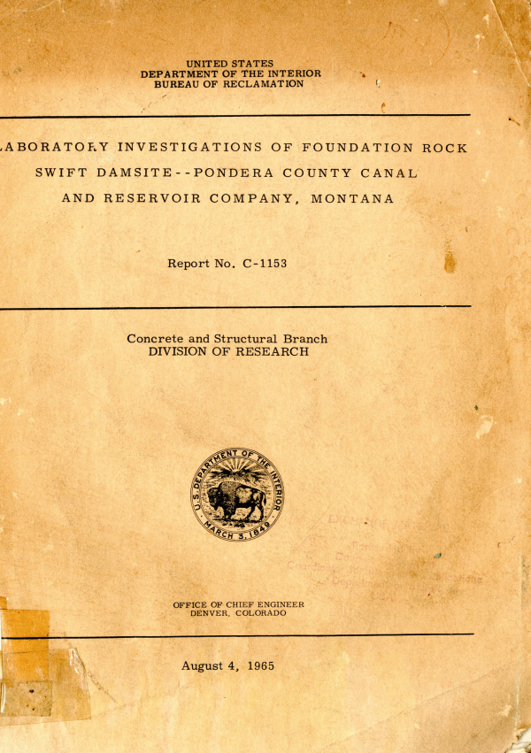 Laboratory investigations of foundation rock swift damsite-pondera county canal and reservoir company, montana